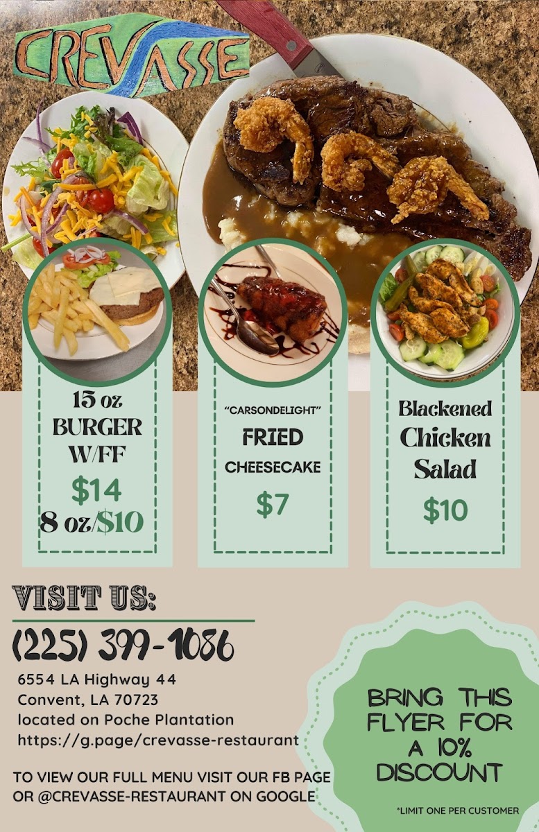 Welcome to Crevasse Restaurant, a hidden gem nestled in Convent, Louisiana. Located at 6554 LA-44, this eatery has quickly become a local favorite, thanks to its inviting atmosphere and deliciously crafted dishes.